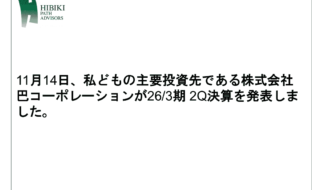 11月14日、私どもの主要投資先である株式会社巴コーポレーション(以下、「当社」)が、26/3期 2Q決算を発表しました。9月12日、私どもは中計見直し・上場維持・非公開化の検討を目的とする特別委員会設置の要請書を当社に…詳細を見る -