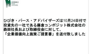 ひびき・パース・アドバイザーズ(以下、「私ども」)は、10月24日付で、投資先の一社である藤倉コンポジット株式会社(以下、「当社」)の森田社長および取締役会に対して、「企業価値向上施策ご提言書」を送付致しました。 …詳細を見る -