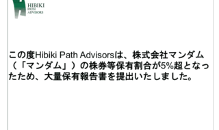 この度Hibiki Path Advisorsは、株式会社マンダム(「マンダム」)の株券等保有割合が5%超となったため、大量保有報告書を提出いたしました。 株価は現状、1,960円のTOB価格を上回って推移しており…詳細を見る -