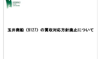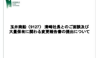 ひびき・パース・アドバイザーズ(以下、「私ども」といいます。)は9月19日、玉井商船株式会社(以下、「当社」といいます。)の株券等の保有割合が5%を超えた旨の大量保有報告書を提出するとともに、9月25日に当社取締役会に対…詳細を見る