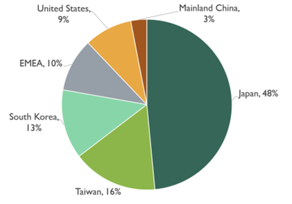 翻って、日本の半導体部素材の領域では、日本のプレゼンスは世界的に見ても未だ高い状況にあり、約50%程度のシェアを維持しています。