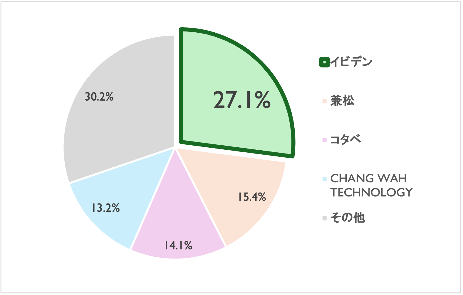 特に期待しているのは、当社の主要顧客であるイビデン株式会社(以下、「イビデン」)の動向です。JPCの25/3期の主要販売先は以下の通りで、イビデンが30%弱を占めています。