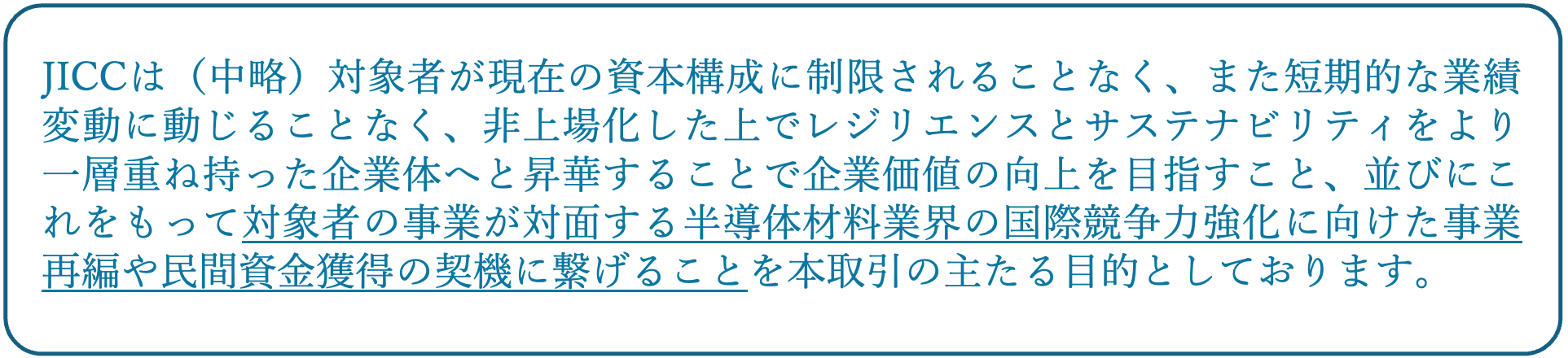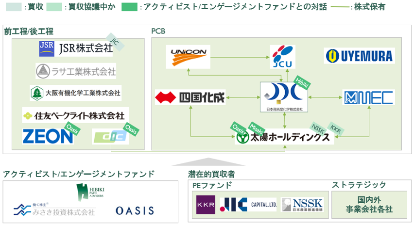 昨今ではアクティビストやPEファンドの活動が活発となり、こういった小国乱立のような状態から業界再編への気運が明白に見えてきています。例えば、ソルダーレジスト世界最大手の太陽ホールディングスには、多くのプライベートエクイティ投資会社から提案が来ていることが伝えられていますし、半導体材料大手のJSR株式会社や近接業界では新光電気工業株式会社は、経済安全保障的視点も含めた、半導体関連業界の強化を目的に、官民ファンドである産業革新投資機構(JICC)により相次いで非公開化されております。そのJSRへのJICCのSPCによる公開買付届出書には、以下のように業界再編を含むニュアンスが記載されています。
