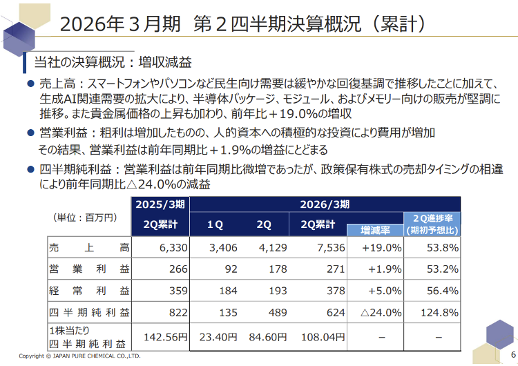 図1:JPCの2026年3月期 第2四半期決算概況
