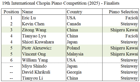 私どもの投資先のKAWAIのShigeru Kawai選択は前回2021年の第18回に続き、最終ラウンドに3名のコンテスタントが残りましたが、その全員が6位入賞となりました。尚、6位入賞者は上記の通り8名ですが、ピアノメーカー別では、Steinway & Sons 3名、Shigeru Kawai 3名、Fazioli 2名となっており、KAWAIは世界トップメーカーにそん色なく肩を並べる結果となっています。